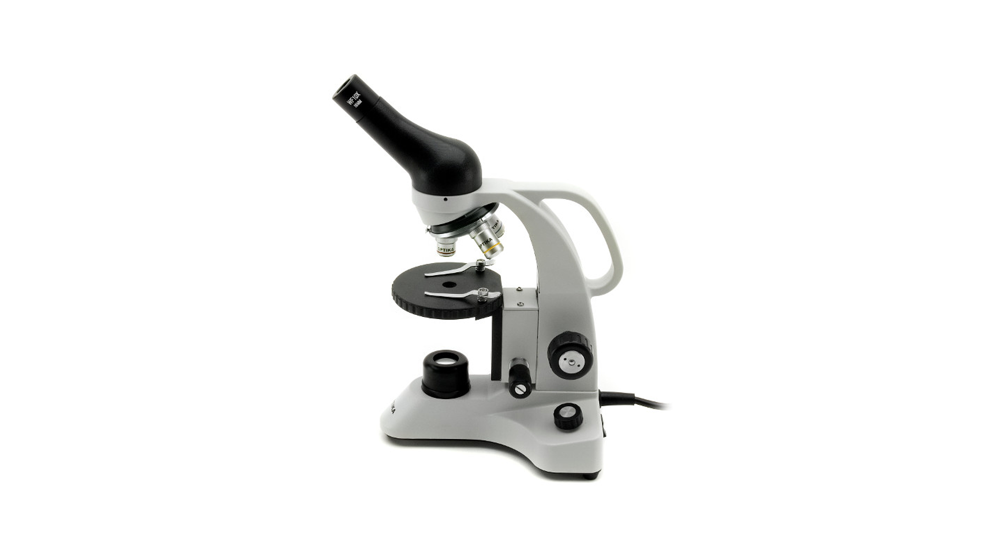 Microscópio monocular sem fio ideal para estudantes e principalmente escolas primárias, com lentes acromáticas, sistema óptico finito, platina fixa redonda e iluminação LED com baterias recarregáveis (não incluídas). Fácil de transportar, equipado com iluminação LED de longa duração.